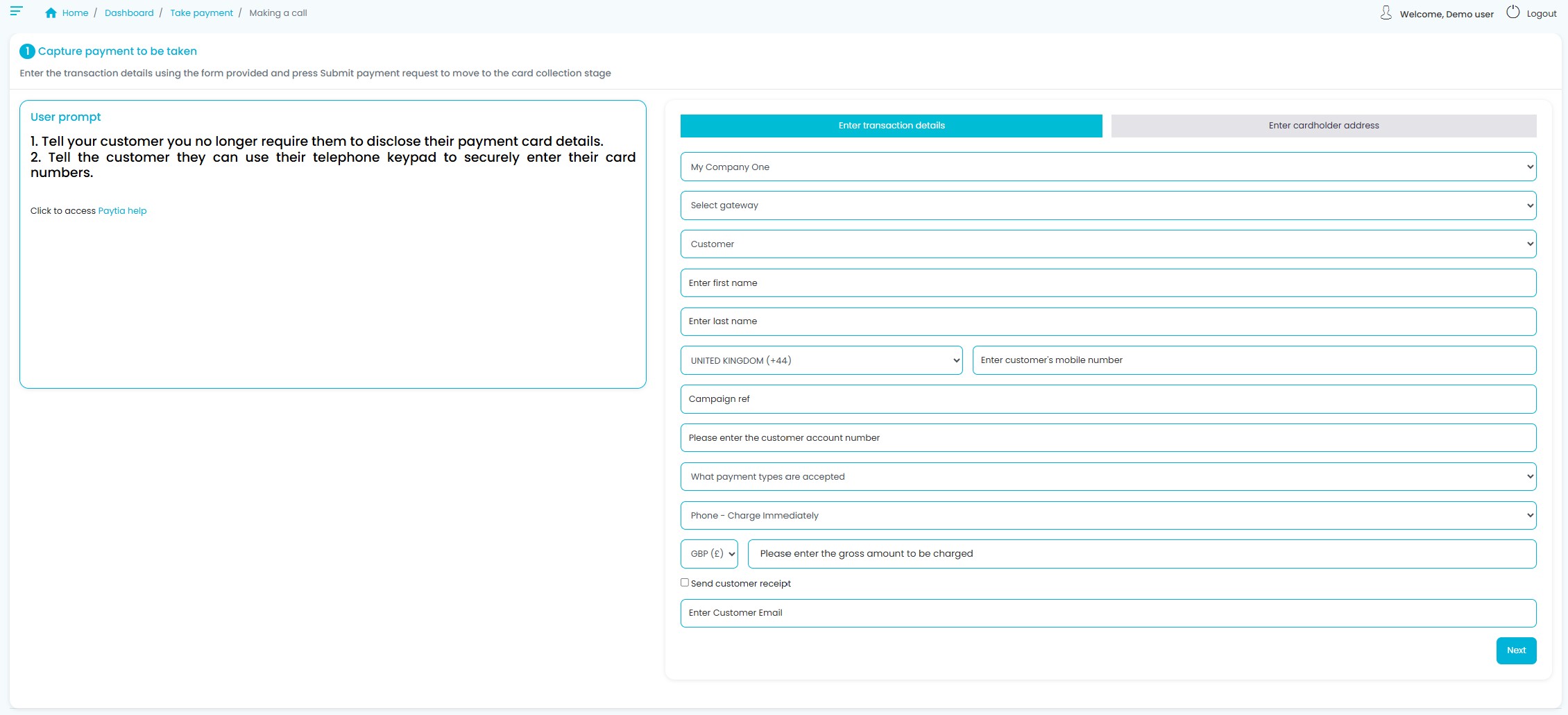 Start a secure capture from the Paytia user interface—card details stay off the call and out of your systems.